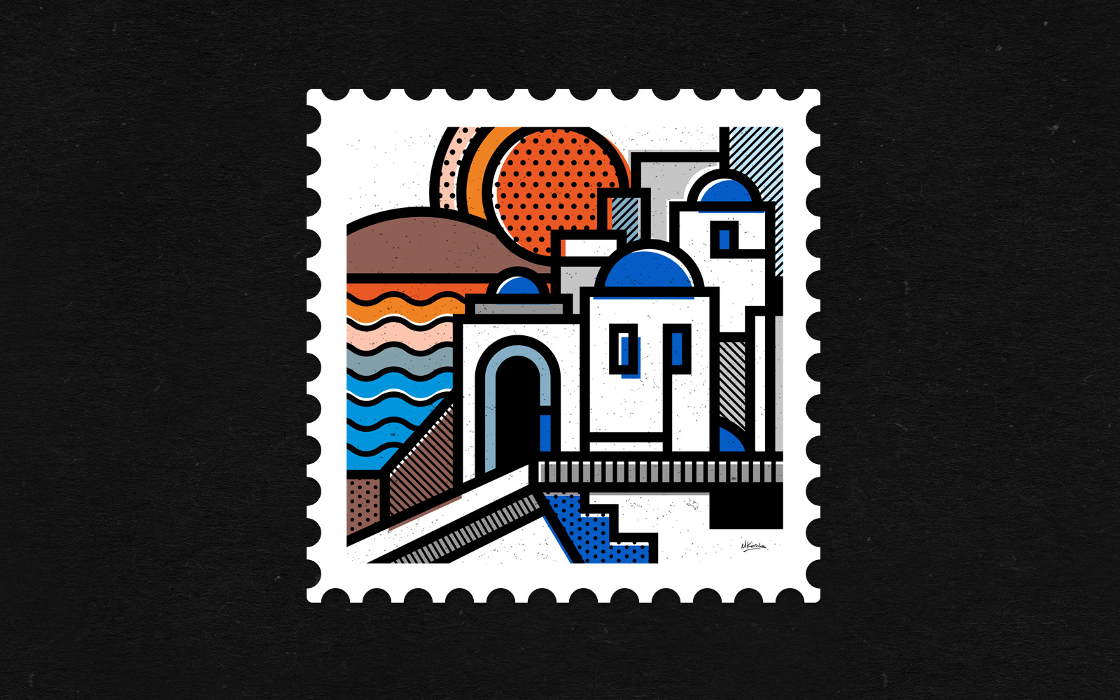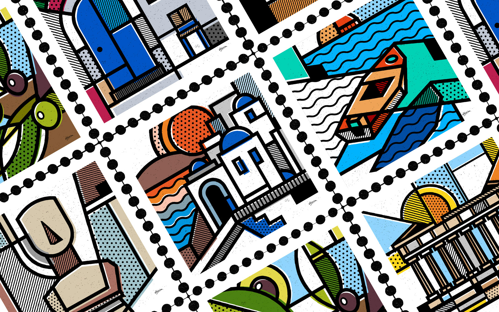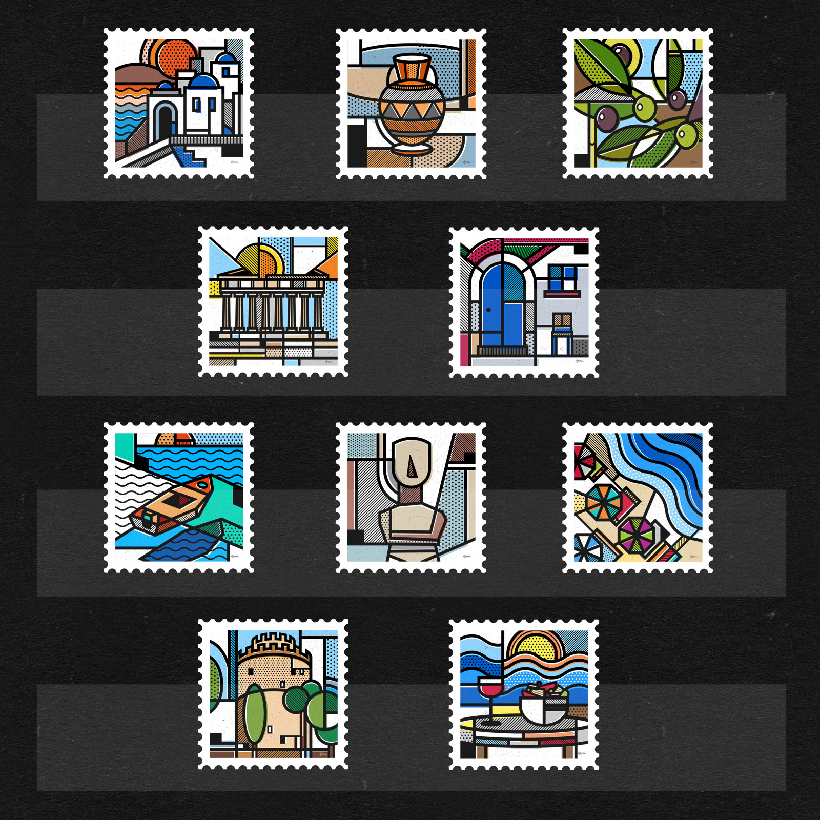 This stamp collection is a self initiated project that aims to show the beautiful side of Greece in an illustrative abstract style. Greece has been a trending topic the past couple of years due to the economic and refugee crisis. So the social and political aspects going on right now in Greece makes us sometimes forget that it is one of the most beautiful and safest places on earth. It combines nature and history, amazing beaches and mesmerizing food. In my collection i tried to visualize in my own style some very characteristic places and sceneries in Greece, like Greek islands, ancient artifacts and landmarks, beaches, traditional houses and food. I will probably make prints available soon too. Hope you enjoy the project and come visit Greece, you won't regret it.