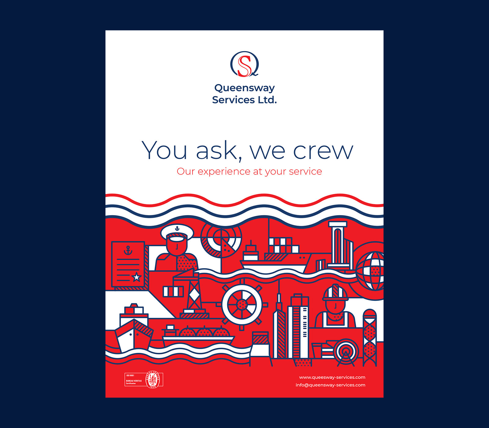 Illustration & layout designed for Queensway manning shipping agency to be used as an ad print in a shipping magazine.