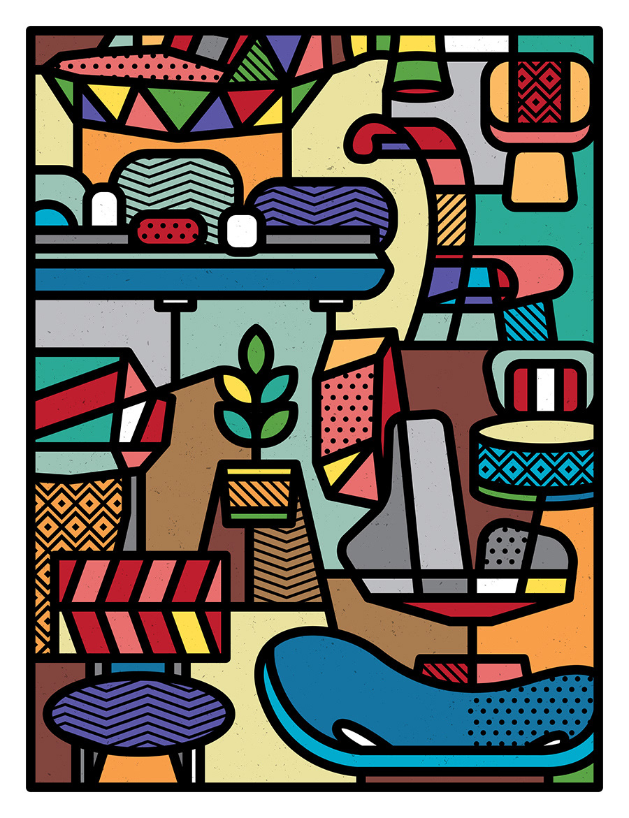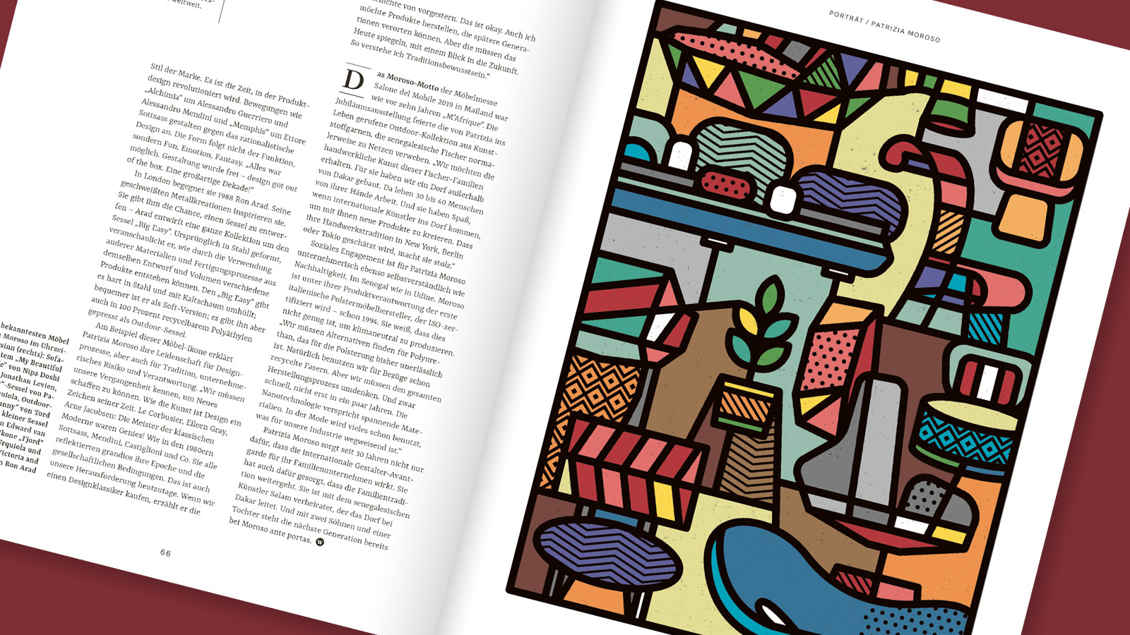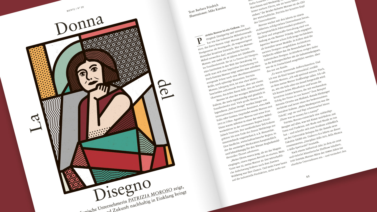 Editorial illustrations commissioned by bp Content for "Deutsche Bank Wealth Management's" corporate magazine "WERTE no. 20". The 2 illustrations i was assigned to make, where regarding an interview of Patrizia Moroso, Art Director of Moroso luxury sofas and seating. The first one is her portrait and the second is an illustration inspired by the company's furniture.