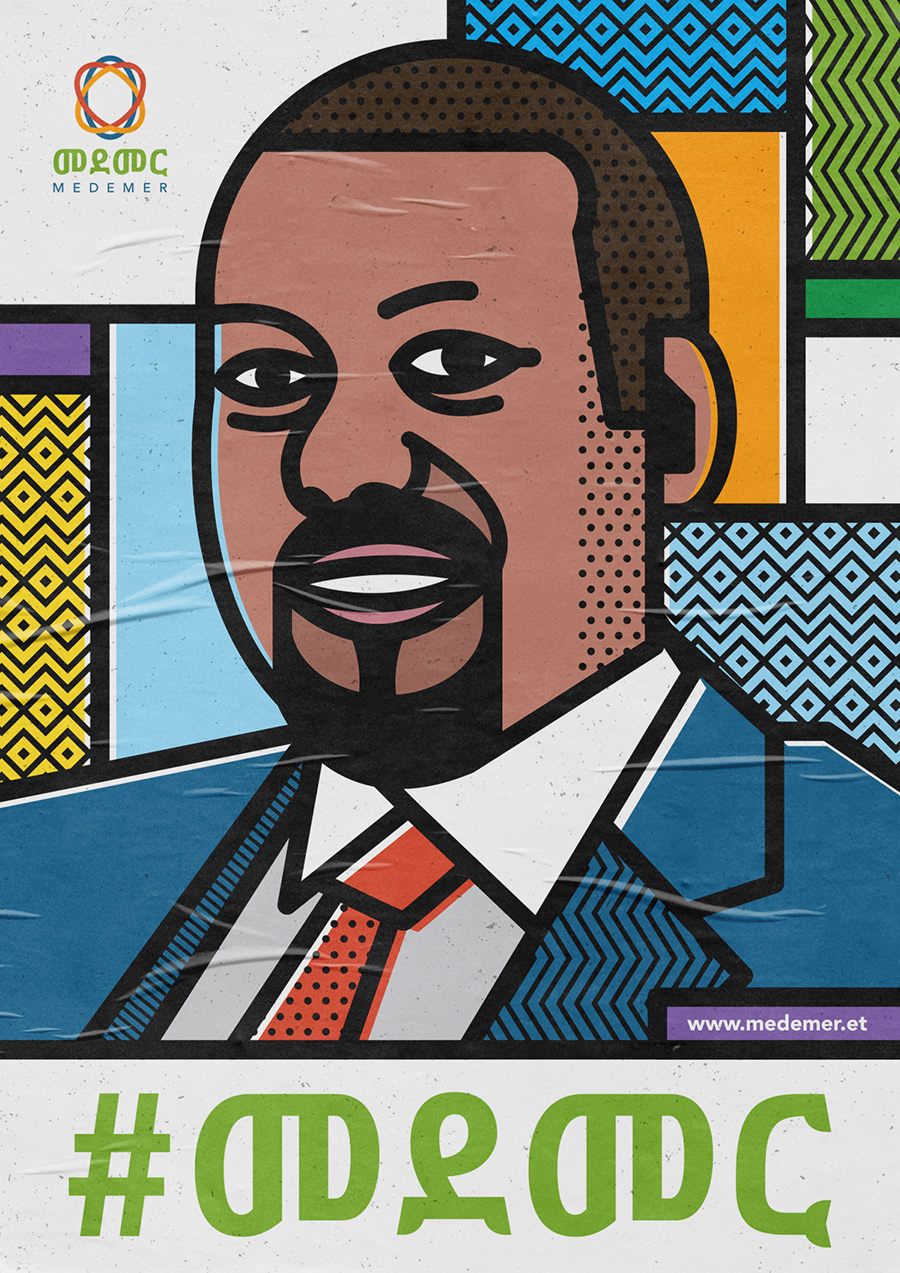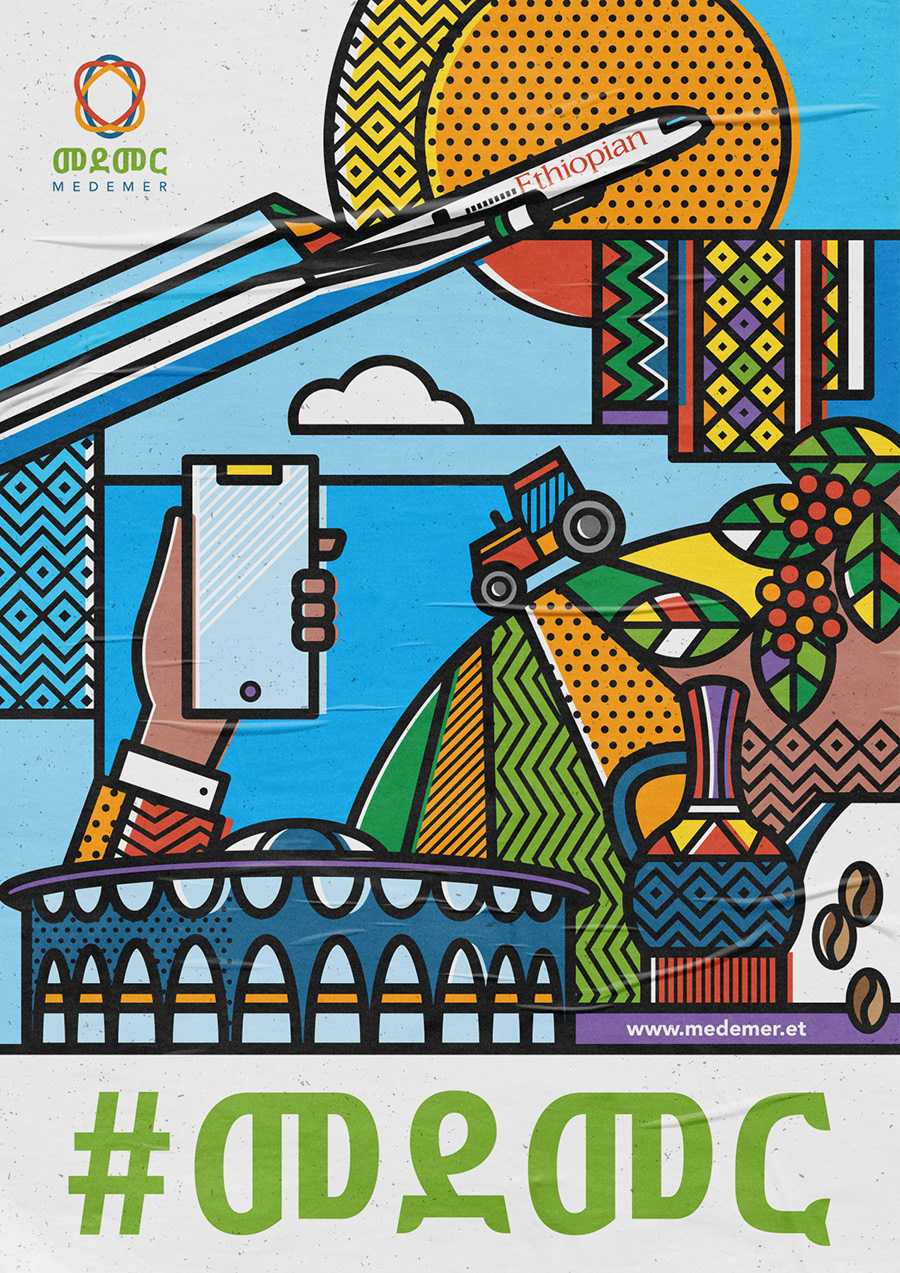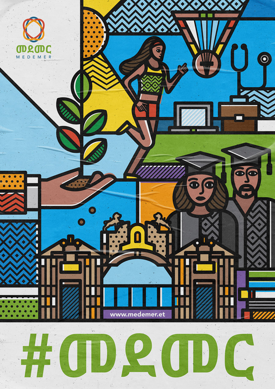 A series of 3 illustrations made to be used as posters, commissioned by the Ethiopian government for their "Medemer" initiative. Medemer is an invitation to Ethiopians to come together. By coming together as one, they are able to create the changes needed for their country to thrive.