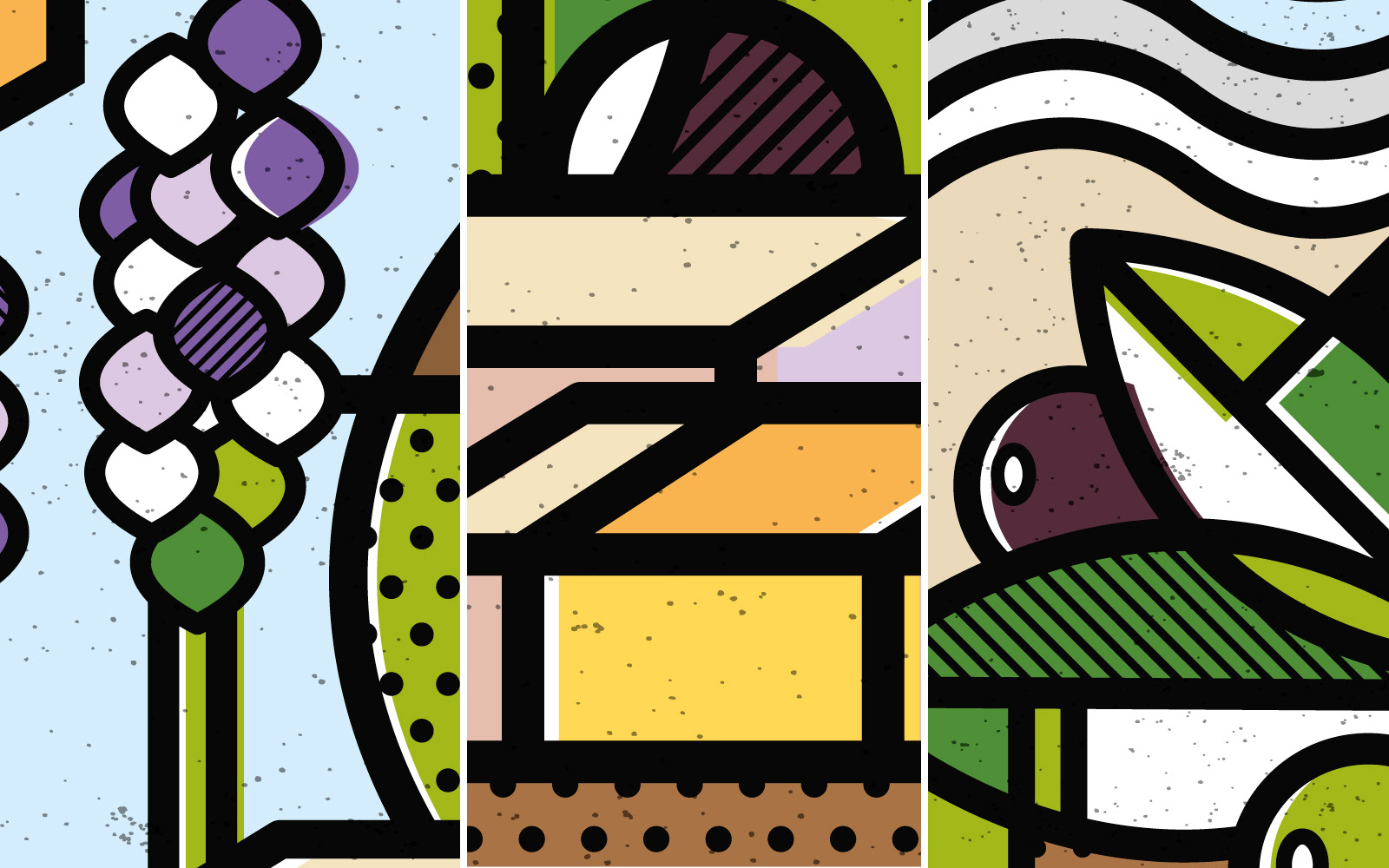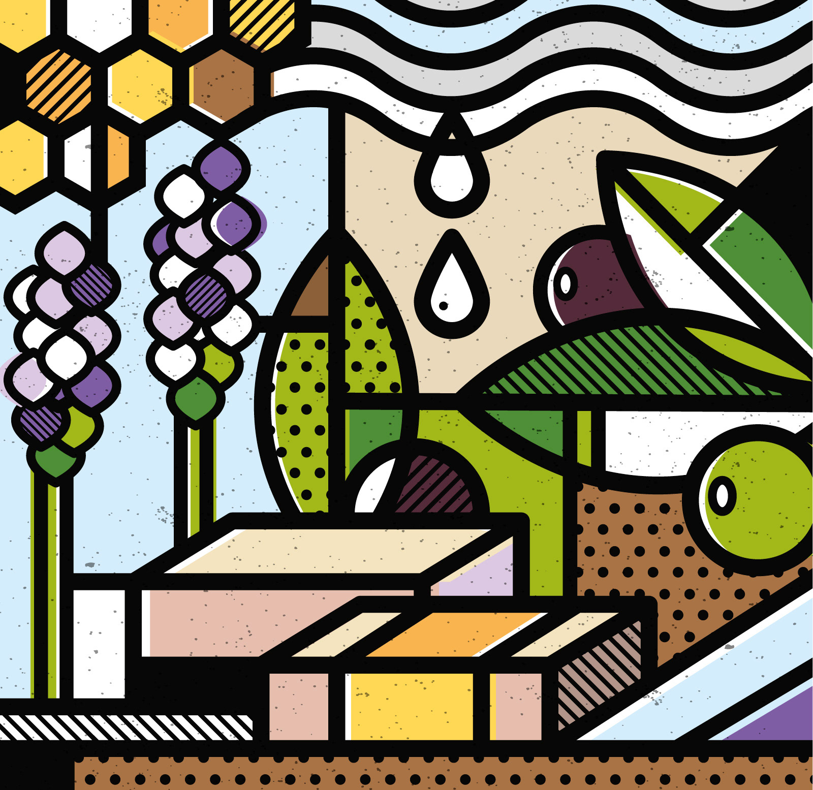 I was asked to make and A5 leaflet that would be eye catching, and illustrate it in my own abstract pop style. I took some of the basic materials the hanmade soaps are made from and made a composition combining them all in to one abstract illustration. The colors needed to be not too vivid but more earthly to bring out the natural side of the soaps. One of the difficulties was to fit all 8 soaps on one side in such a small leaflet. That's where i decided to make icons inspired by the main illustration and style for each soap and it's main ingredients.
