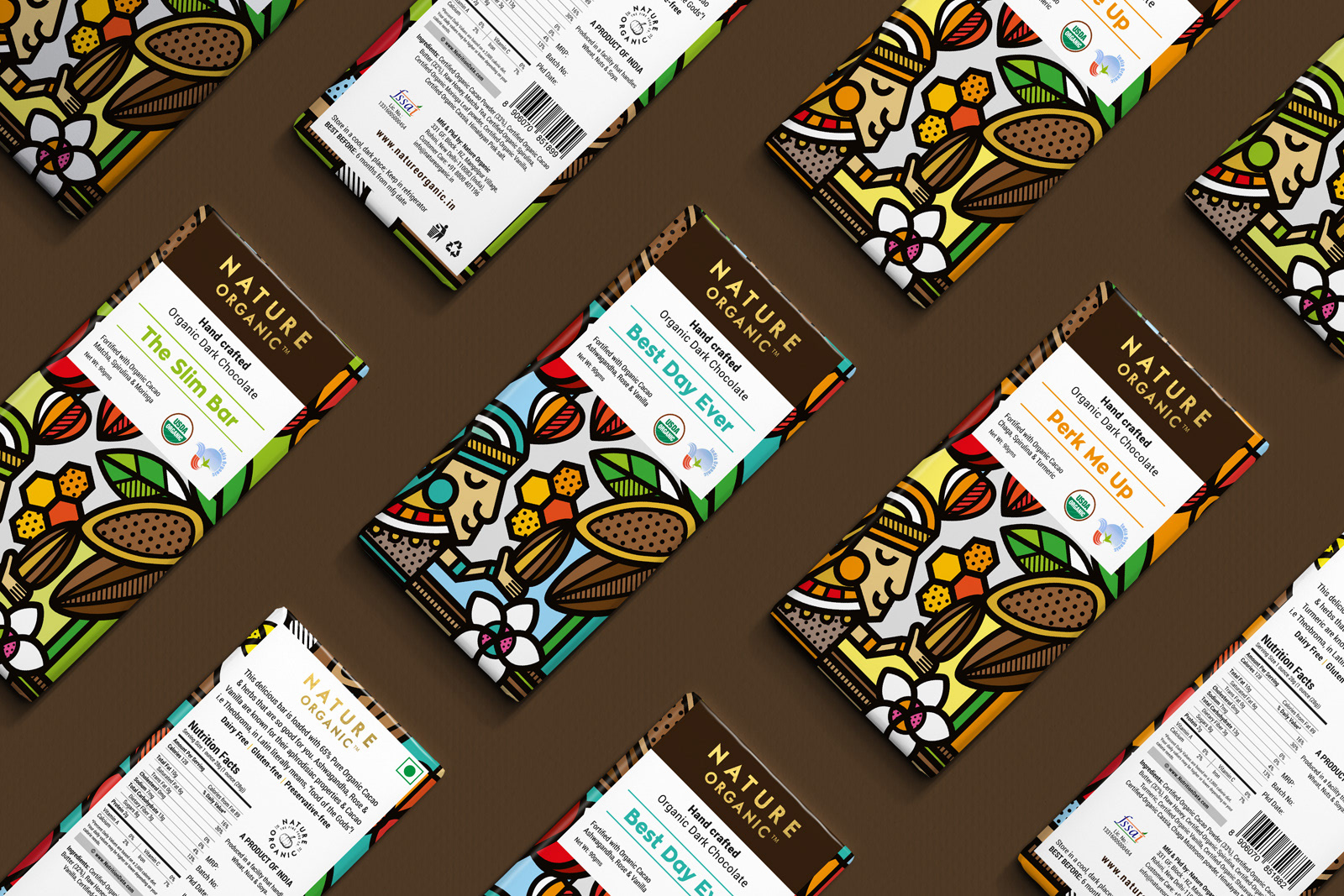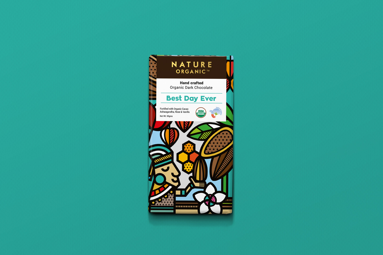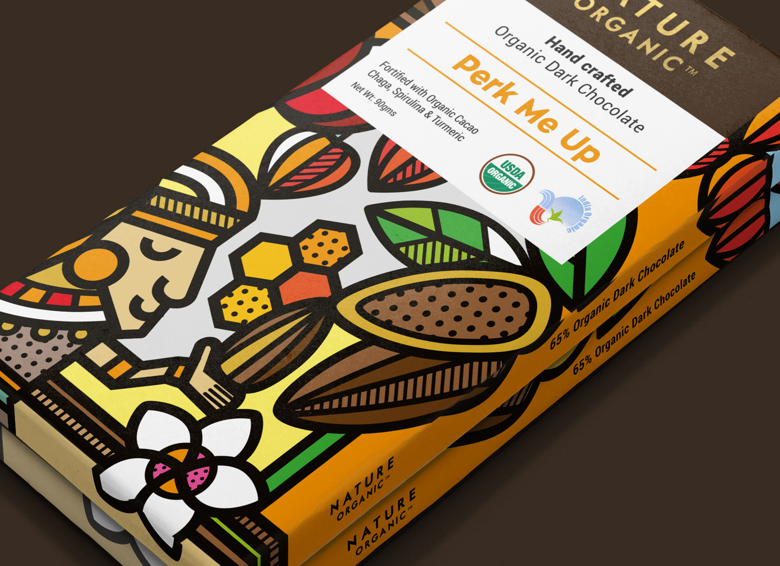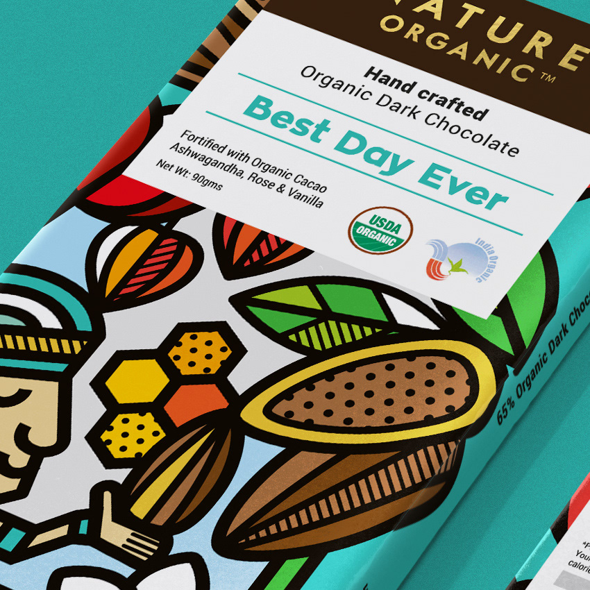 Earlier this year I was commissioned by the food brand Nature Organic to redesign their handcrafted organic chocolates. The first part of the brief was to bring color to the packaging. Their previous packaging was mostly in black & white and that was proven to be a problem in India’s market, as people there want colors. India after all is known to love colors. At the same time a little luxury feeling was also something that had to be considered, but created a little conflict, as usually luxury and colorful don’t really go together. So what we did, was just give a touch of gold foil on the logo on a dark brown background and the rest of the text in a clean white area. The illustration as usual is in my own style, bold, colorful, with a few patterns and with not too much detail, creating a fun, vibrant, fresh and maybe a little classy, chocolate packaging. The elements used in the illustration scene are from the main ingredients of the chocolates. Such as rose, vanilla, honey, ashwagandha and of course cacao beans and trees. Last but not least I was also asked to illustrate a character that worshiped the cocoa beans inspired by the ancient Aztecs and Mayans, that where the first in recorded history to use cocoa beans for chocolate. Once we finalized the main packaging we made another two chocolates where each has it’s own colors and name. Hope you enjoy the project.