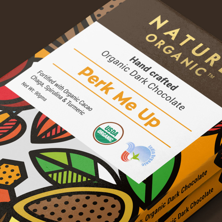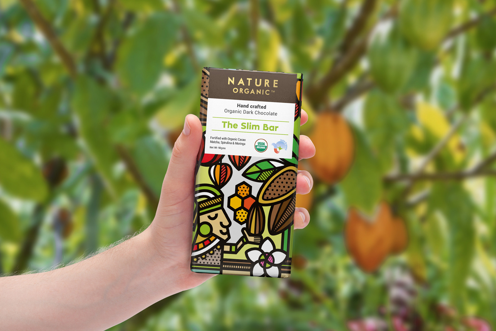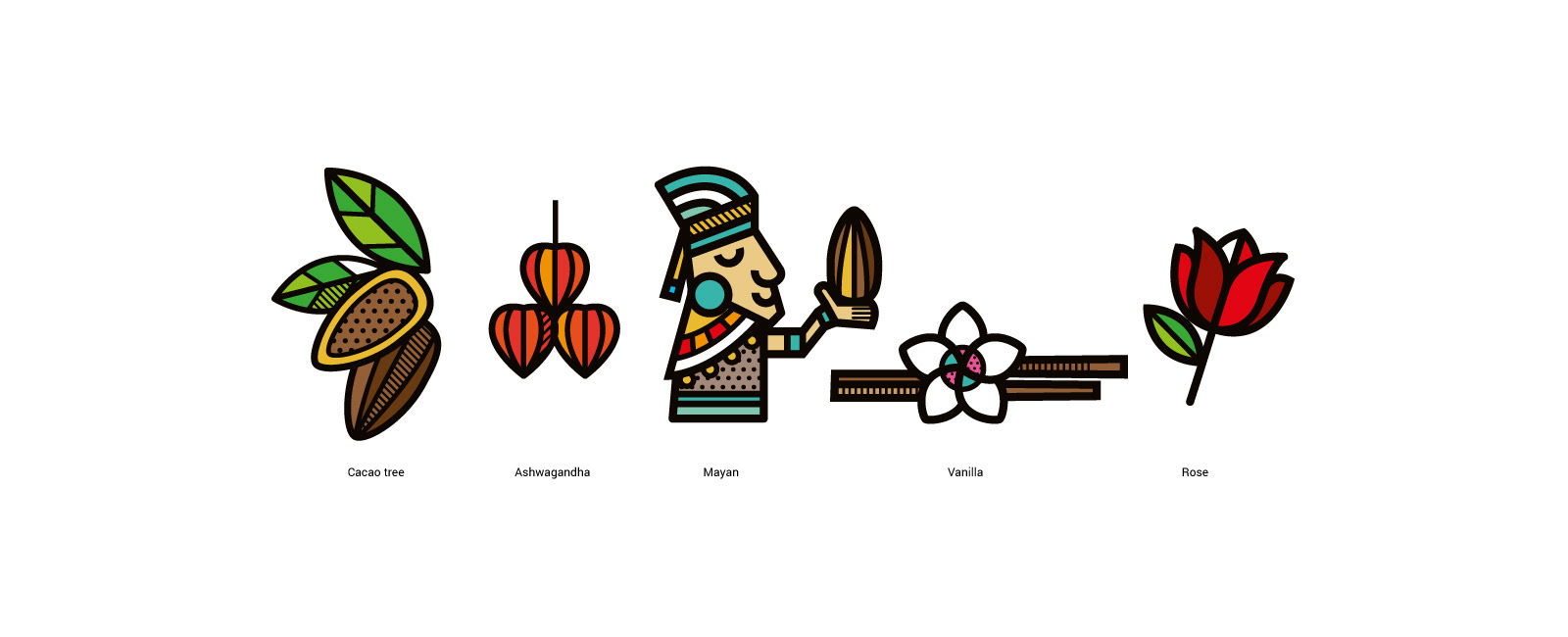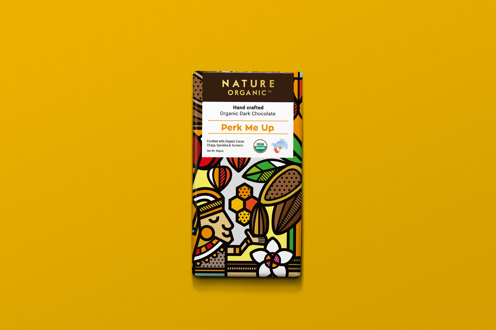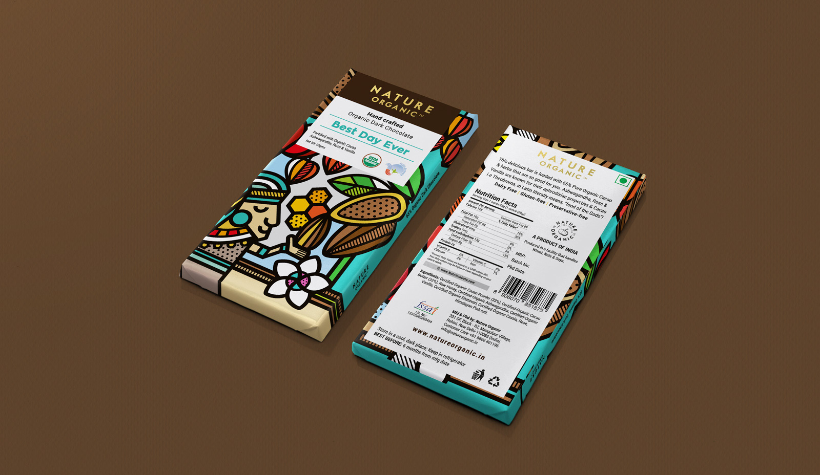 Earlier this year I was commissioned by the food brand Nature Organic to redesign their handcrafted organic chocolates. The first part of the brief was to bring color to the packaging. Their previous packaging was mostly in black & white and that was proven to be a problem in India’s market, as people there want colors. India after all is known to love colors. At the same time a little luxury feeling was also something that had to be considered, but created a little conflict, as usually luxury and colorful don’t really go together. So what we did, was just give a touch of gold foil on the logo on a dark brown background and the rest of the text in a clean white area. The illustration as usual is in my own style, bold, colorful, with a few patterns and with not too much detail, creating a fun, vibrant, fresh and maybe a little classy, chocolate packaging. The elements used in the illustration scene are from the main ingredients of the chocolates. Such as rose, vanilla, honey, ashwagandha and of course cacao beans and trees. Last but not least I was also asked to illustrate a character that worshiped the cocoa beans inspired by the ancient Aztecs and Mayans, that where the first in recorded history to use cocoa beans for chocolate. Once we finalized the main packaging we made another two chocolates where each has it’s own colors and name. Hope you enjoy the project.